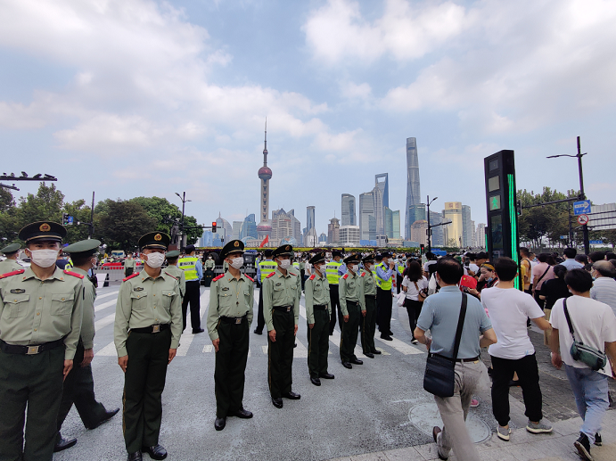 上海外滩南京东路江西路口、南京东路四川中路路口看到,2014年黄金周期间曾使用的“开关式”过马路方式重启了:当红灯亮时,8至10名武警并排站立、排成一道人墙挡住行人;绿灯时,则让开斑马线护送人群过街。除了这些重要路口,武警战士还在河南中路与中山东一路之间的南京东路站岗,走几步就有一名武警,同时还有交警站岗或巡逻,确保一批批游客在南京东路步行街及外滩之间安全穿行。每天客流超过100万人次,在外滩的中山东一路南京东路路口,极其容易发生人员滞留甚至踩踏。”上海市黄浦区警方相关人士坦言,这个重点区域的问题,必须用特殊的方式解决。多种技术手段检测景区人数。