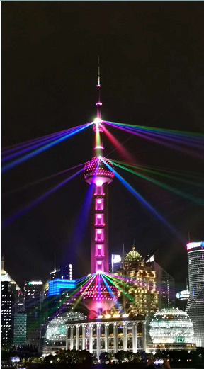 东方明珠塔高四百八十九米,位于上海市中心,夜晚东方明珠在漆黑的天空下,散发发出的光芒缓缓旋转照亮了周围的天空,四周的建筑更是一起和东方明珠散发着炫目的光芒,庆祝着国庆节这一天的到来,大珠小珠落玉盘,东方明珠的光芒,不仅仅是一种灯光表演秀也是庆祝中国解放93周年寓意着中国更加美好的未来。