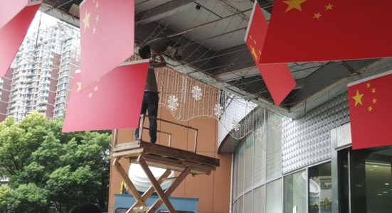 在国庆和中秋双节的修灯师傅在下雨刮大风之前,抓紧时间把灯固定,以免大风刮起来会砸到人,看见修灯师傅爬上爬下很是辛苦,看见一会再左边修修一会蹲下来找找零件看着师傅身姿心里想着一定要注意安全了,师傅那么忙碌其实就是为了我们的安全,只有我们安全他就放心了,也希望师傅早早回家带着他的家人去上海的每一个景色也和家人吃到好吃的月饼,也要在工作的时候注意安全,有一个名人说过小小的身躯有大大的能量,这就是我身边的国庆。