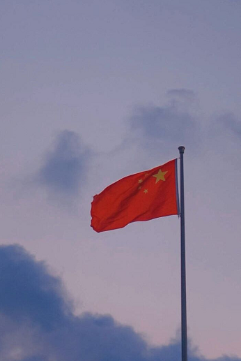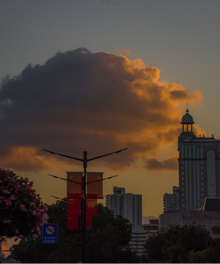 这是我在国庆节最后一天的傍晚拍的。那天傍晚出现了让我喜出望外的云。折射出的光让悬挂在路灯上国旗更加美丽。