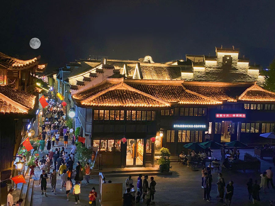 11. 《古镇秋景》一轮明月悄然升起,熙熙攘攘的人群在古镇的小巷子里走动着,小巷两旁的古玩店、食品店和景观灯使游人们驻足,古镇重新焕发起了勃勃生机。有一家三口抱着小孩儿的大人,有结伴同行的老人们,有手拉手蹦蹦跳跳的少年,还有共同出游的一大家子,场面其乐融融。看到这热闹的场面,我不禁顺着台阶走上高地,拍下留念。大上海的活力依旧!当时为了抗疫,全国人民万众一心,足不出户、大街小巷冷冷清清。忍一忍,风雨过后,中国仍是那番繁华盛景!