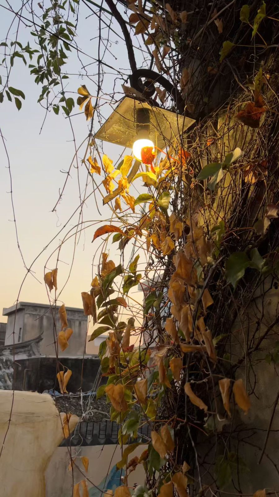 风掠过的时候,藤叶簌簌轻响,光影便在墙面摇摇晃晃。远处的灰瓦老屋浸在淡橘色的天光里,轮廓柔和得像晕开的水墨画。灯盏的光不算亮,却把这一隅的秋意揉得温热——枯萎的是时节,鲜活的是藏在枝蔓里的生趣。这一刻,老街的静与灯影的暖缠在一起,连晚风都慢下来,仿佛怕惊扰了这墙藤蔓与一盏灯的私语。