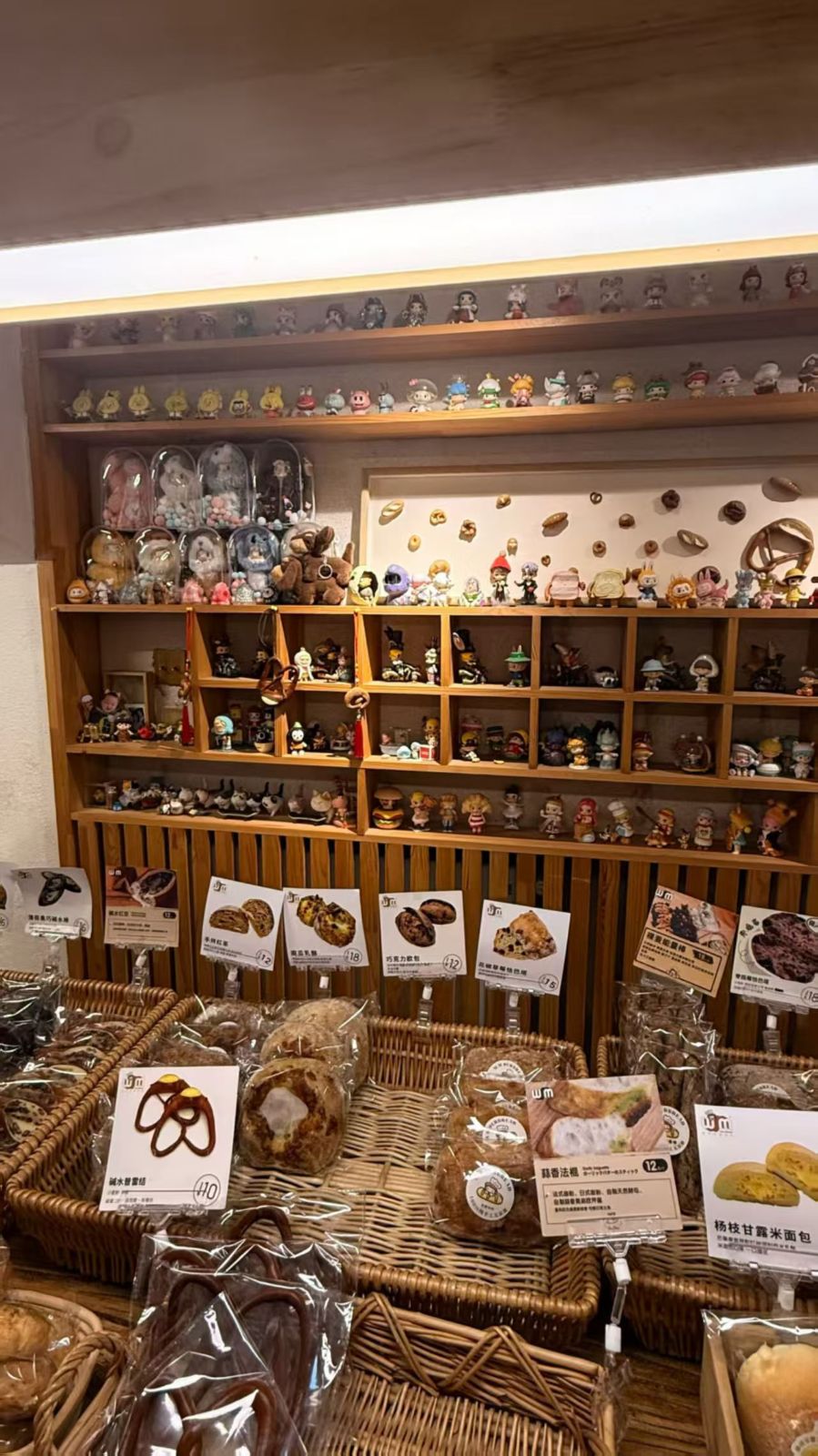 货架下方的藤编篮里,码着满满当当的面包点心,透明包装袋裹着的碱水结纹路清晰,杨枝甘露米面包、蒜香法棍的标签立在一旁,价格牌上的字迹清秀。巧克力麻薯、焦糖坚果包的卡片也错落摆着,麦香混着淡淡的甜香在空气里飘着。一边是萌趣十足的潮玩世界,一边是香气四溢的面包市集,两种截然不同的美好撞在一起,连指尖划过藤篮的纹路时,都觉得满是温柔的烟火气。