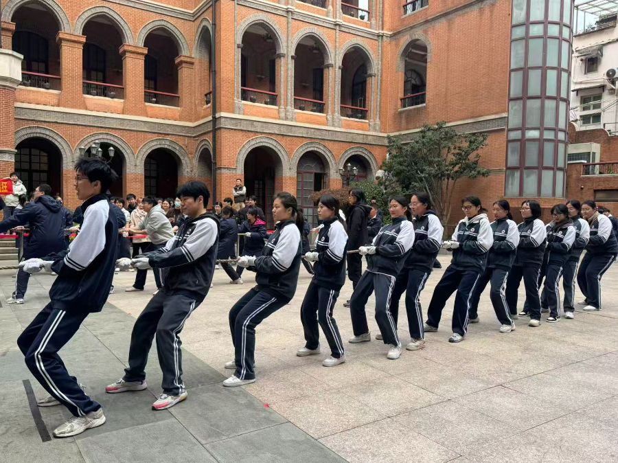 今年12月,我校在操场举办了拔河比赛。当时天气寒冷,但全体参赛同学的参与热情十分高涨。
